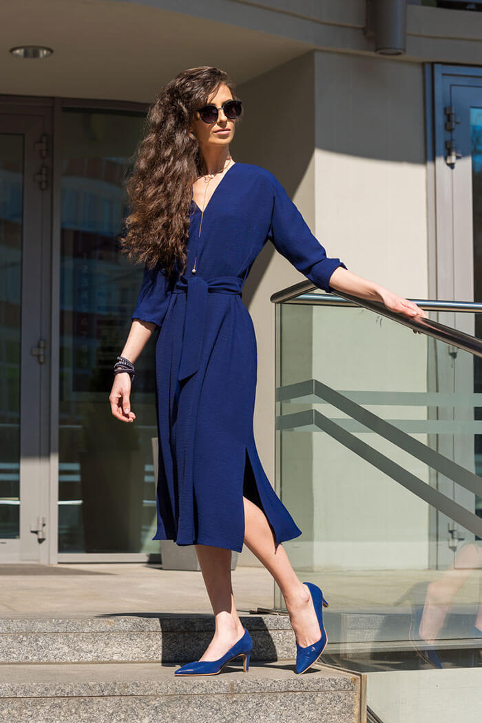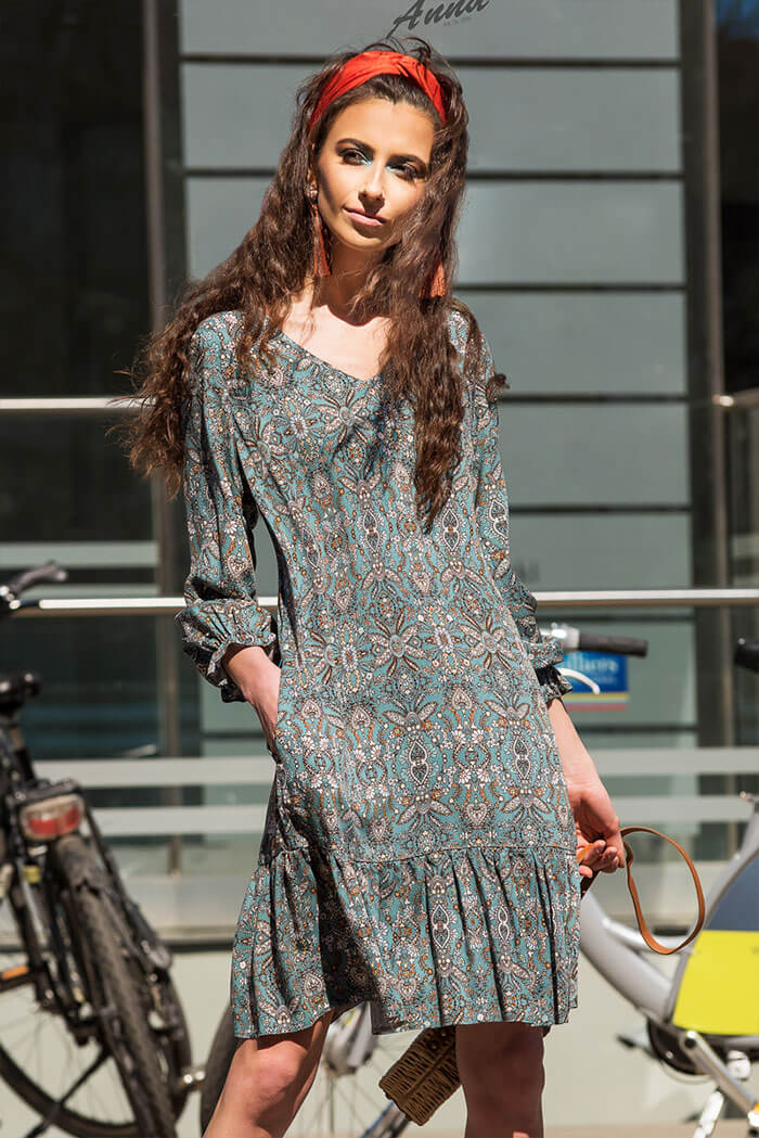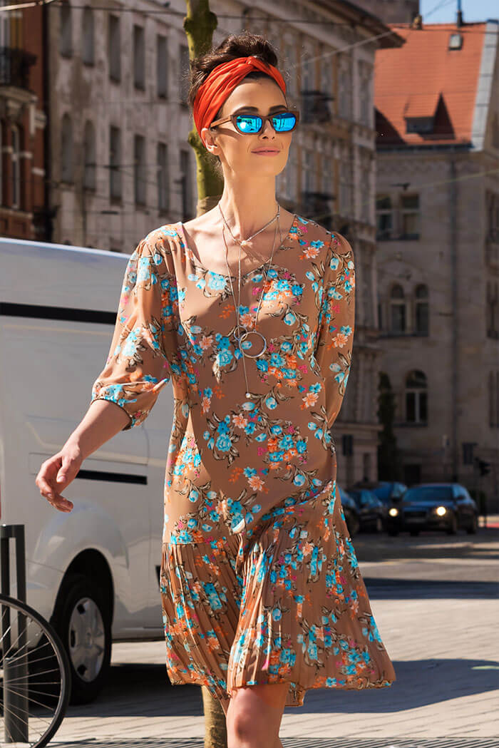 - Suknia Kontrafałda – wzór kwiaty, granat